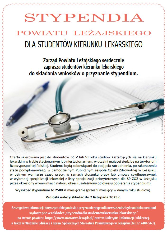 Zarząd Powiatu Leżajskiego ogłosił nabór wniosków o przyznanie stypendium dla studentów kierunku lekarskiego w roku akademickim 2025/2026. O stypendium mogą ubiegać się studenci IV, V lub VI roku kierunku lekarskiego, kształcący się w trybie stacjonarnym lub niestacjonarnym w uczelni mającej siedzibę